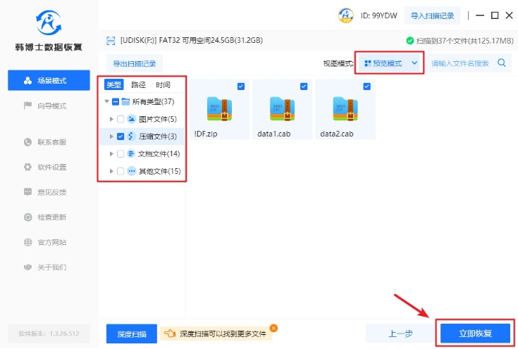 4. 掃描操作完成后,記得使用“預覽模式”,來查看每個文件的內容,確保沒有任何遺漏。只有確認文件正確無誤后,再點擊下方的“立即恢復”按鈕。
