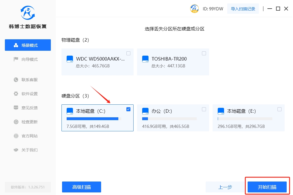 2. 根據具體的數據丟失情況,定位具體的硬盤分區,接著點擊“開始掃描”按鈕。