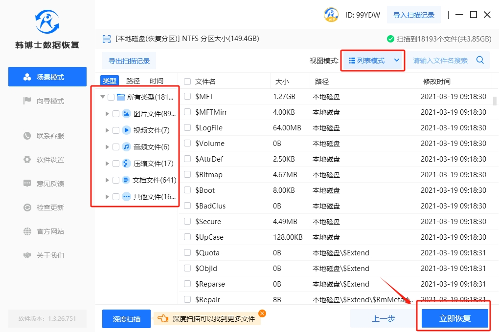 3. 韓博士正在進行文件掃描,請保持耐心等待。掃描完成后,勾選要恢復的文件,然后點擊“立即恢復”按鈕,即可順利完成數據恢復過程。