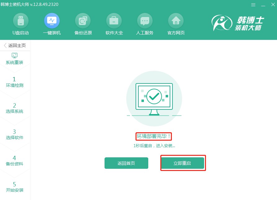 1.首先,先把“韓博士裝機大師”下載到電腦桌面,雙擊桌面圖標來啟動程序。在打開的界面中,點擊“開始重裝”。