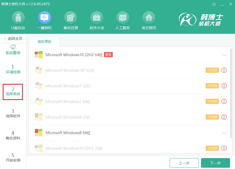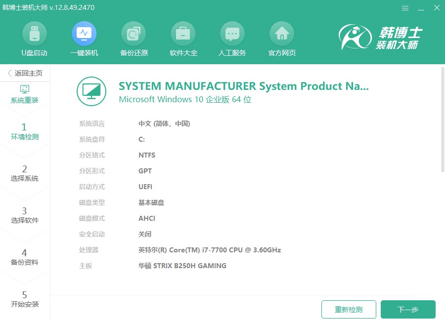 2.韓博士會對設備進行環境檢測,檢測完成后,點擊界面上的“下一步”,進入到系統重裝的下一階段。