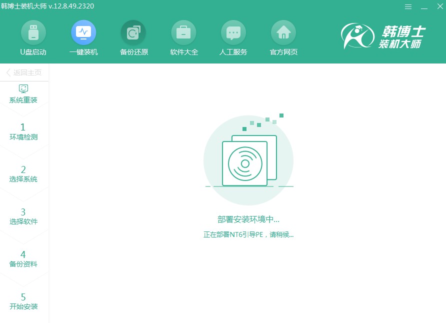 1.打開(kāi)韓博士官網(wǎng),下載裝機(jī)大師安裝程序,完成安裝后啟動(dòng)軟件,在界面上選擇“開(kāi)始重裝”,然后按照提示操作。