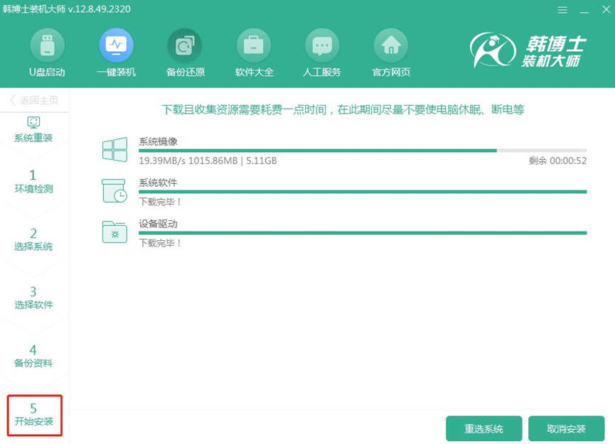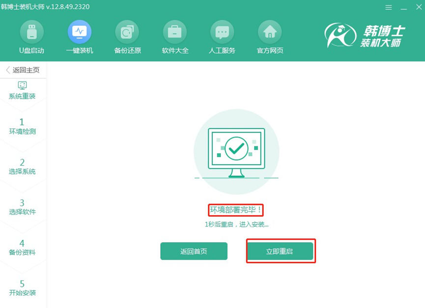 1.請檢查“韓博士裝機大師”是否已保存到您的電腦桌面。找到該軟件圖標后,雙擊啟動,然后在主界面上選擇“開始重裝”,以啟動安裝流程。